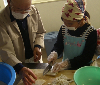 西城地域のコンニャクづくりの達人を講師に招いて、子供たちと一緒にコンニャクを作ってみました。子供たちは芋を切って捏ねて丸めて茹でる事でコンニャクが出来ることが楽しかったとのことです。もちろんコンニャクづくりをするのは初体験。地域の講師も普段と違って子供と一緒に作るのは初めてで少し勝手が違ったようです。